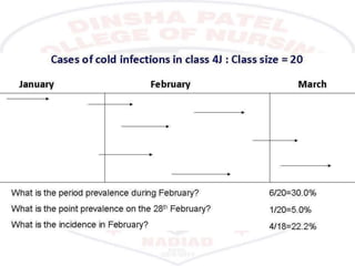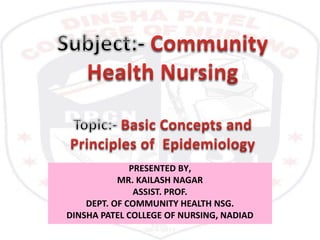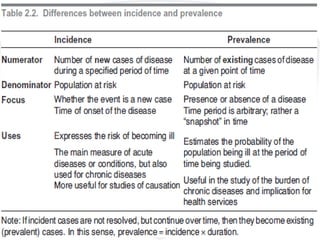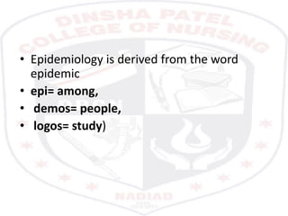 This document provides an overview of epidemiology. It defines epidemiology as the study of disease distribution, patterns, and determinants in populations along with the application of this study to disease control and prevention. It discusses key epidemiological topics like descriptive epidemiology, analytical epidemiology, measures of disease frequency including incidence and prevalence, epidemiological study designs like case-control and cohort studies, and the role of epidemiology in public health. The goal of epidemiology is to eliminate or reduce health problems in communities by identifying risk factors and promoting population health.