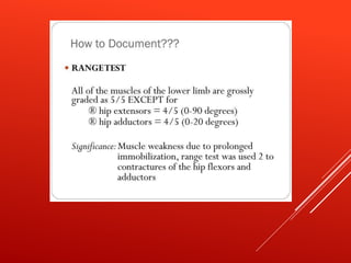 Manual muscle testing is a procedure used to evaluate muscle strength. It involves manually applying resistance against a patient's movement through their available range of motion. There are several types of manual muscle tests including tests of individual muscles, muscle groups, and functional tests. The results are often graded on a scale like the Oxford scale. Manual muscle testing provides important information for diagnoses, evaluating treatment effectiveness, and tracking patient progress. It requires skill and standardization to obtain reliable results.