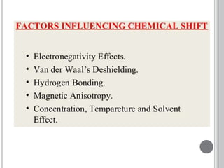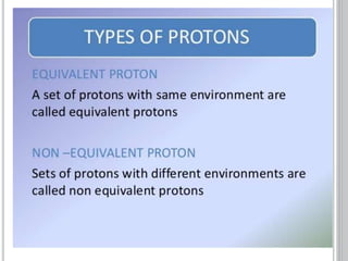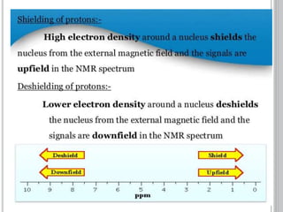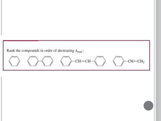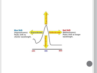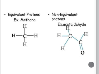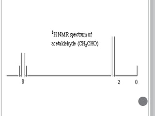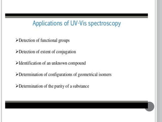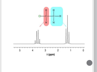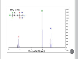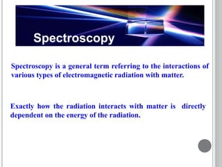 This document provides an overview of various spectroscopy techniques including UV-Vis, IR, and NMR spectroscopy. It discusses key concepts like electromagnetic radiation, photon energy, and the electromagnetic spectrum. It describes the interactions between electromagnetic radiation and matter that are measured in different spectroscopy methods. It also provides examples of spectra for organic compounds and explanations of spectral features.