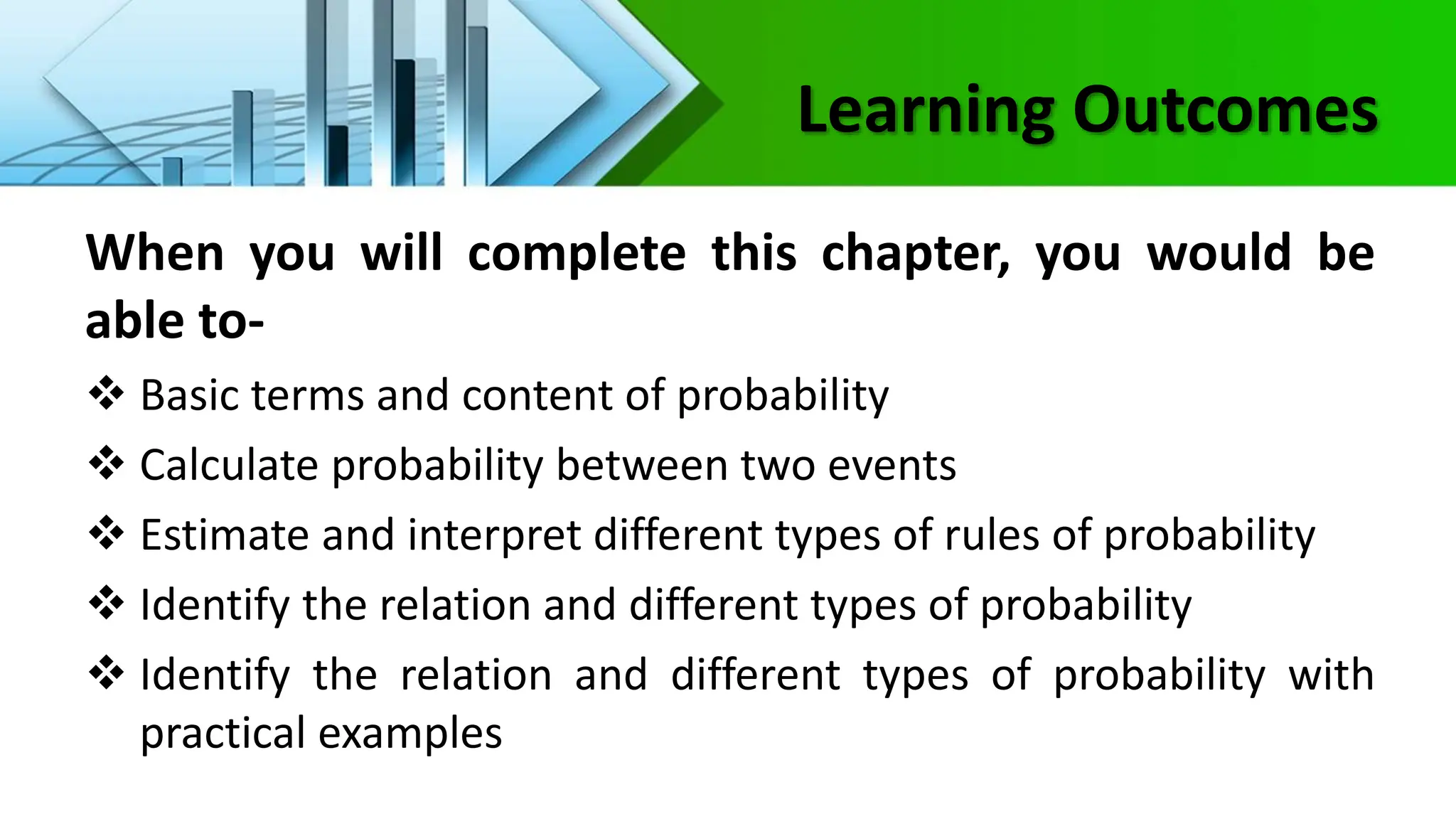 Chapter 9 covers the basic concepts of probability, including terminology, laws, and different types such as joint, marginal, and conditional probability. It emphasizes the significance of probability in various fields, especially in statistical inference and decision-making. The chapter also includes practical examples and exercises to demonstrate the application of probability rules.