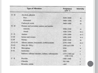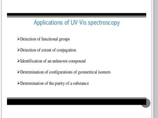 This document provides an overview of UV-visible and infrared spectroscopy, detailing how electromagnetic radiation interacts with matter and the principles underlying absorption techniques. It discusses the energy levels affected by ultraviolet and visible wavelengths, and the vibrations and rotations induced by infrared radiation, along with the relevance of electronic transitions and molecular structure in spectral analysis. The document also highlights key concepts, terminology, and applications of spectroscopy in the identification and analysis of various compounds.