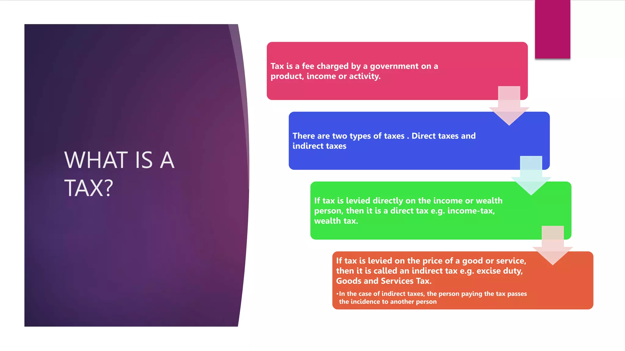 This document provides an overview of direct tax laws and practices in India. It defines what a tax is, describing direct and indirect taxes. Income tax is identified as the most significant direct tax in India. The key laws and rules governing income tax are outlined, including the Income Tax Act of 1961, annual Finance Acts, Income Tax Rules of 1962, circulars and notifications, and legal decisions from courts. Total income is computed in several steps, including determining residential status, classifying and computing income under different heads, making adjustments, and applying tax rates along with surcharges and cesses to determine the final tax payable.