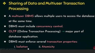 Backup n recovery-in case of hardware n software failures+recovery subsystem responsible for responsible for ensuring that transaction resumes from where its interrupted