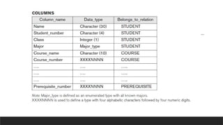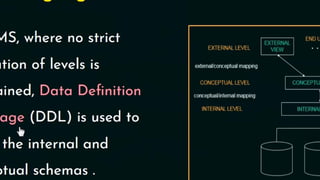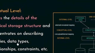 #32 Conceptual schema sometimes called as logical schema-describes the stored data in terms of the datamodel of the dbms. In our sample university database,these relation contains information about entities,such as students and faculty and about relationship such as students enrolment in courses