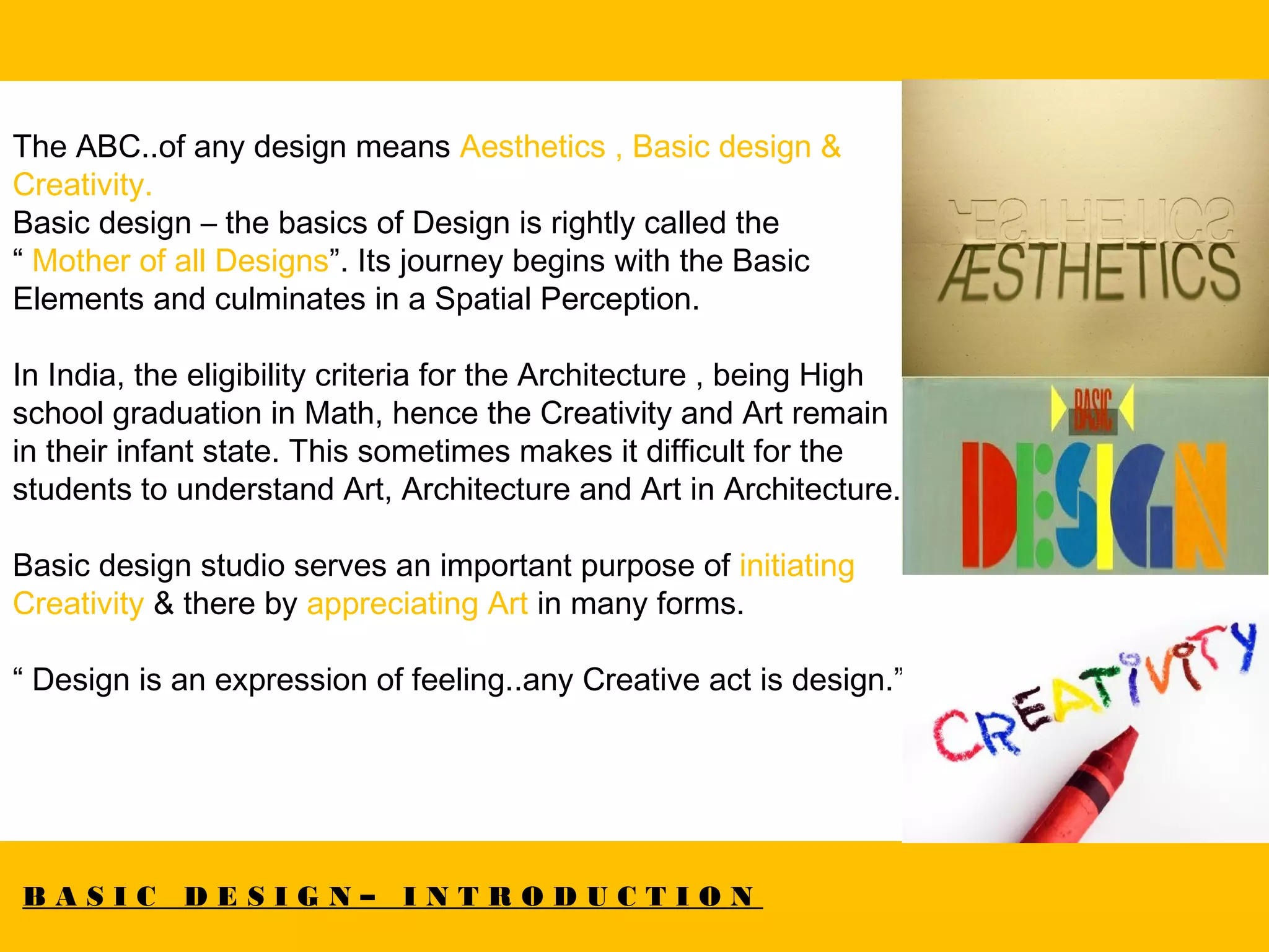 The document provides an overview of basic design elements and principles integral to the fields of art and architecture, emphasizing the foundational aspects of aesthetics, creativity, and spatial perception. It outlines key elements of design such as point, line, shape, form, color, texture, and space, along with design principles including balance, proportion, rhythm, movement, and unity. The content aims to enhance students' understanding and appreciation of visual language as part of their creative development in design education.