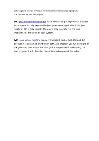The document explains the differences between JDK, JRE, and JVM in Java development. JDK (Java Development Kit) is used for developing Java applications, containing JRE, a compiler, and other tools, while JRE (Java Runtime Environment) allows for executing Java applications. JVM (Java Virtual Machine) is crucial for both JDK and JRE, as it executes Java programs line by line.