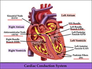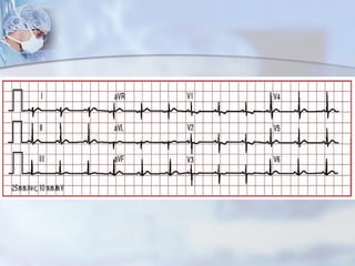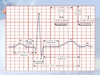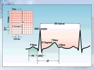 The document explains the basics of ECG (electrocardiogram) and the heart's electrical activation process, detailing myocardial cell types and the conductive system. It provides steps for interpreting ECG readings, including rhythm, rate, and specific wave characteristics. Additionally, it outlines terminology and the significance of various segments within the ECG tracing.
