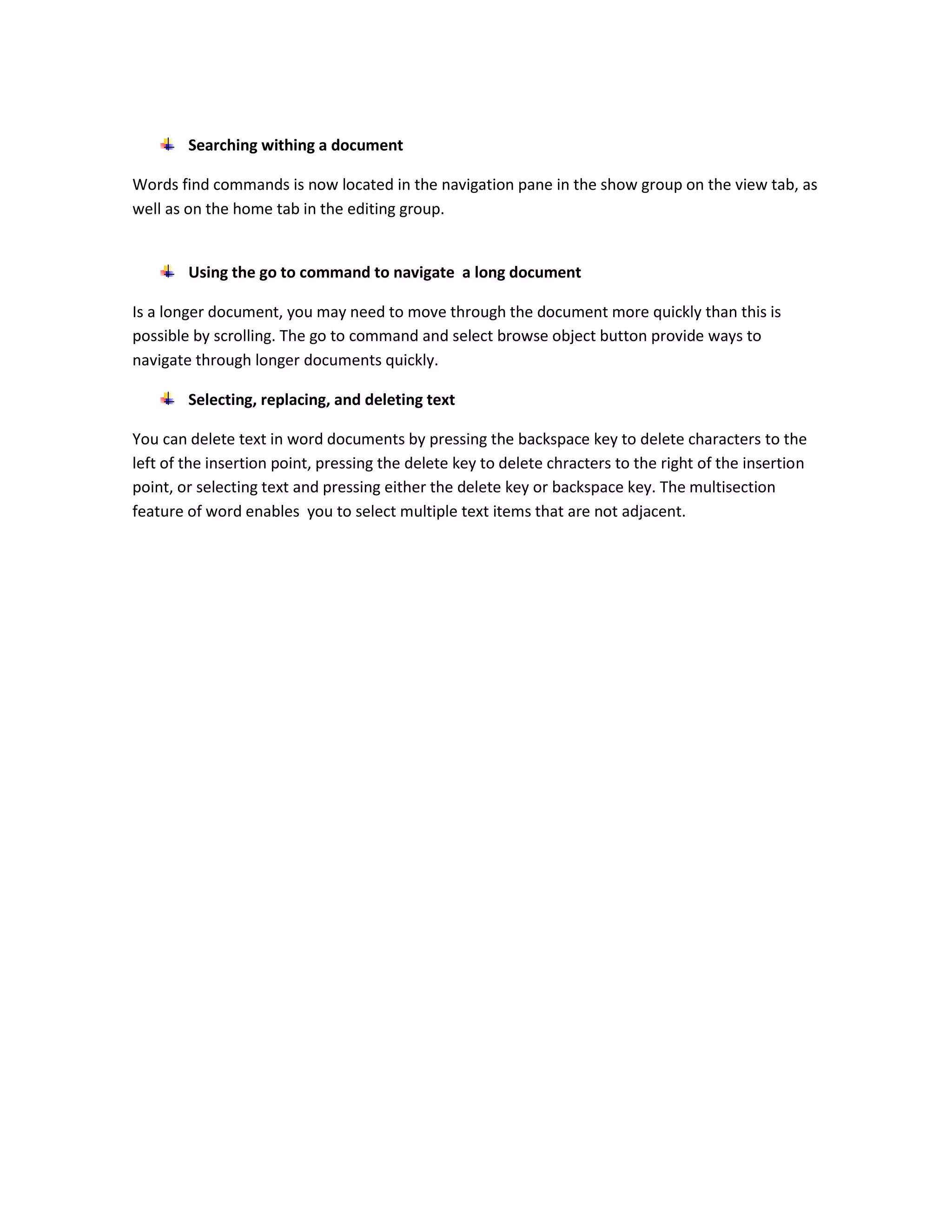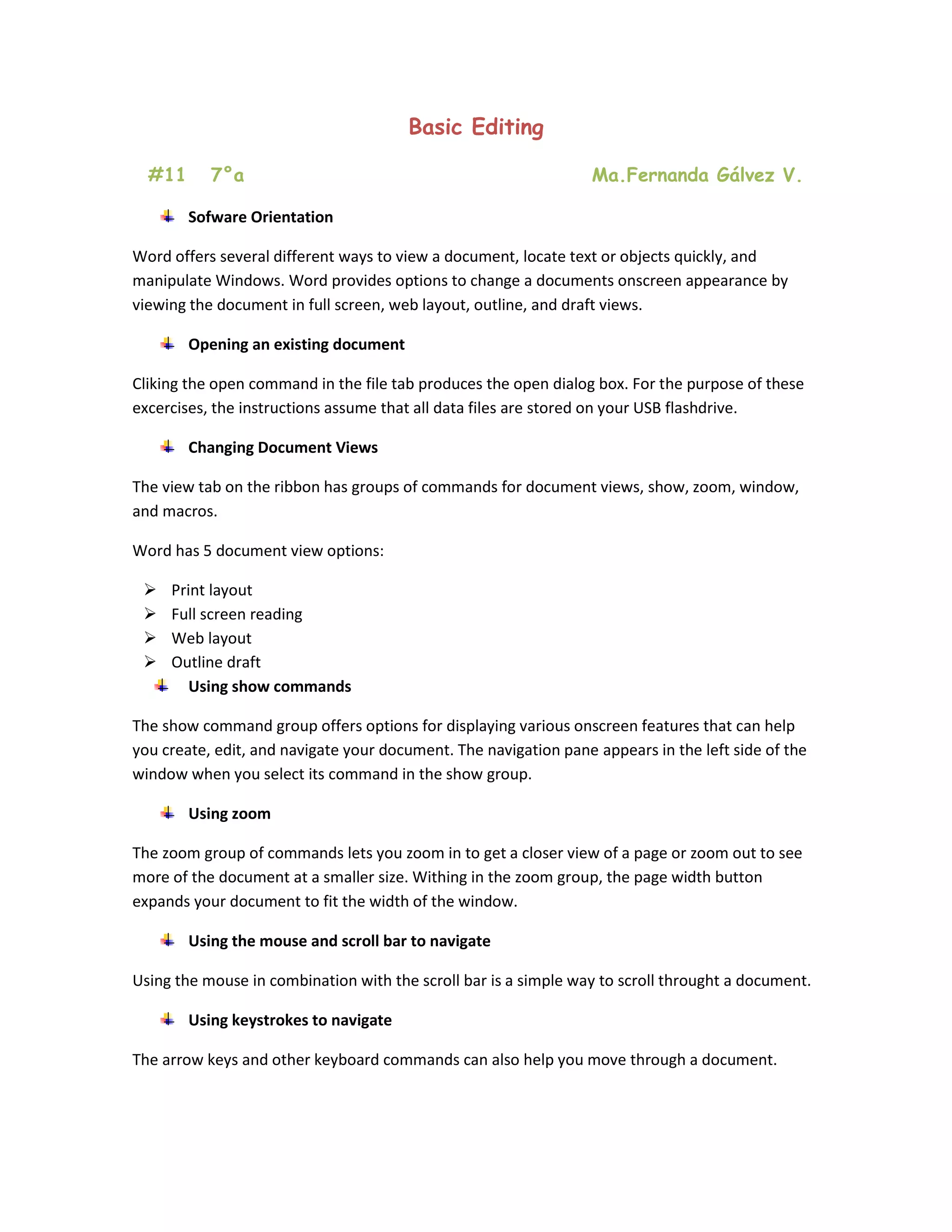 The document provides an overview of basic editing functions in Microsoft Word, including how to view and navigate documents, open existing documents, change document views using the View tab, use zoom tools to adjust text size, and select, replace, and delete text. Word offers various views like Print Layout, Full Screen Reading, Web Layout, and Outline. The View tab contains commands for document views and navigation tools. Zoom tools allow resizing text and the page width button fits the document width to the window. Keyboard shortcuts, mouse scrolling, and the Go To command help navigate documents. Search and selection tools allow finding and modifying text.