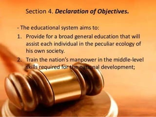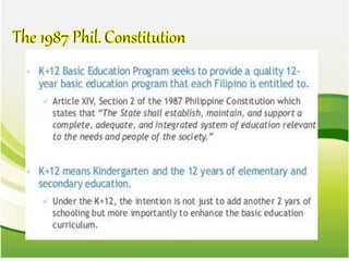 The document provides an overview of the K-12 Basic Education Program implemented in the Philippines. The key points are: