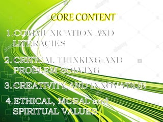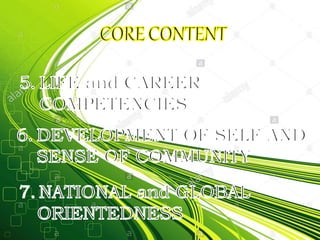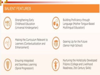 1) The K-12 program expands basic education from 10 to 12 years by adding two years of senior high school. It aims to better prepare Filipino students for tertiary education, employment, and global competitiveness.