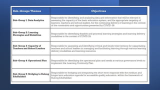 The Basic Education Learning Continuity Plan (BE-LCP) aims to ensure that learners continue their education safely during the COVID-19 pandemic by adapting K-12 curricula and implementing multiple learning delivery modalities. It addresses health, safety, and equity concerns while providing clear guidance for schools and engaging stakeholders in the educational process. The plan also emphasizes innovation and flexibility in response to evolving circumstances and includes strategies for monitoring and evaluating its effectiveness.