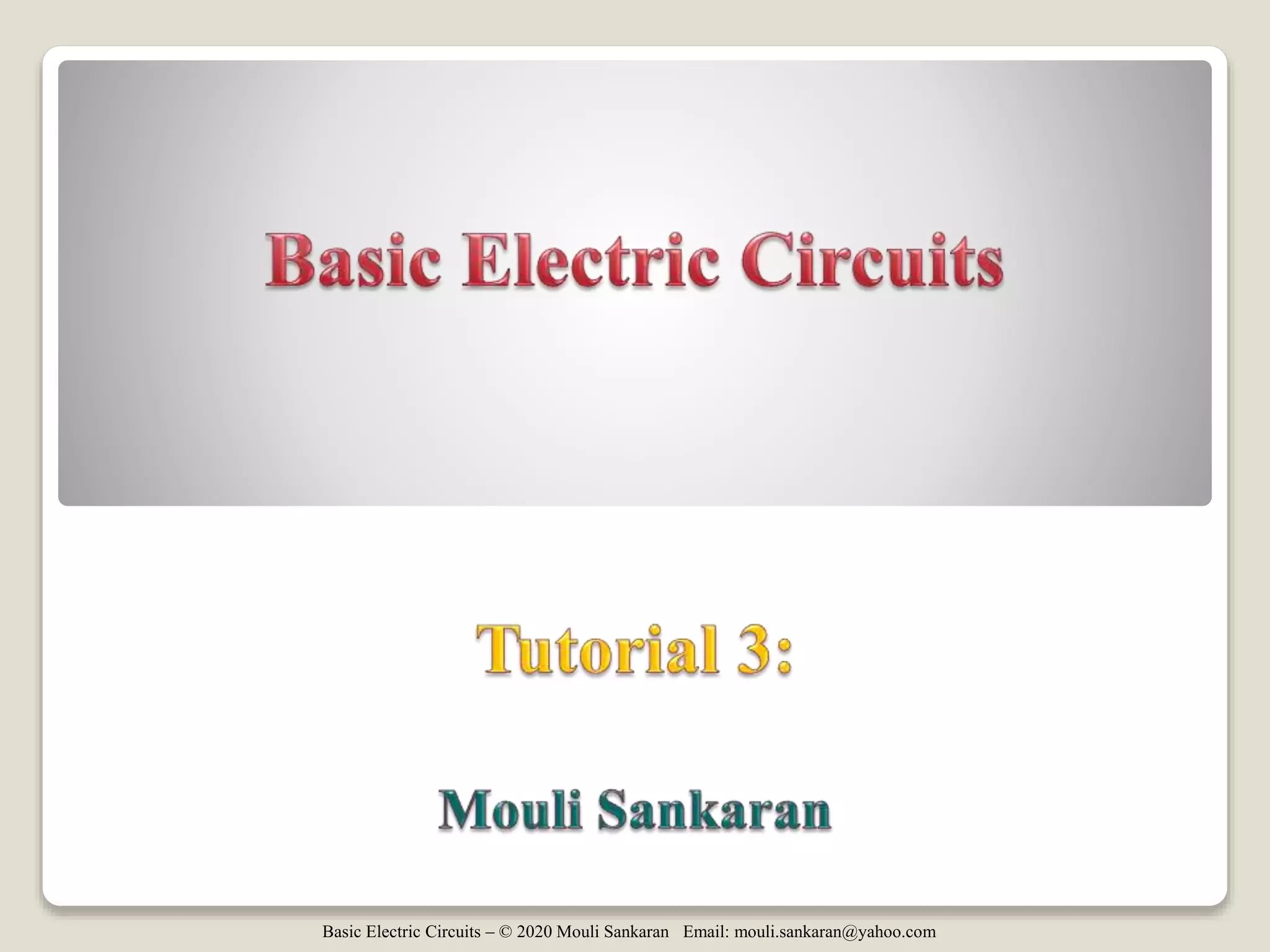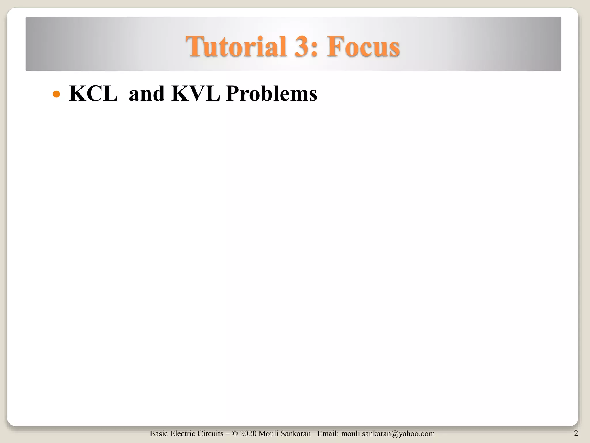 This document contains tutorials and practice problems related to applying Kirchhoff's Current Law (KCL) and Kirchhoff's Voltage Law (KVL) to solve for unknown voltages and currents in electric circuits. It includes 6 sample circuit problems where the key steps of writing KCL and KVL equations at nodes and around loops are demonstrated to find values such as the voltage across a resistor (vx), total circuit current (ix), or power dissipated by individual resistors. Diagrams illustrate the node-branch analysis method and solutions are provided for determining variables like resistance (RA) from given voltages and currents.