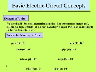 The document outlines the fundamental concepts of electric circuits, including units of measurement, basic quantities such as current, voltage, and power, as well as definitions of charge and circuit elements. It explains the significance of assumptions in direction and polarity while analyzing electric circuits, and emphasizes the conservation of energy within these circuits. Additionally, it introduces independent and dependent sources as key components in circuit design.
