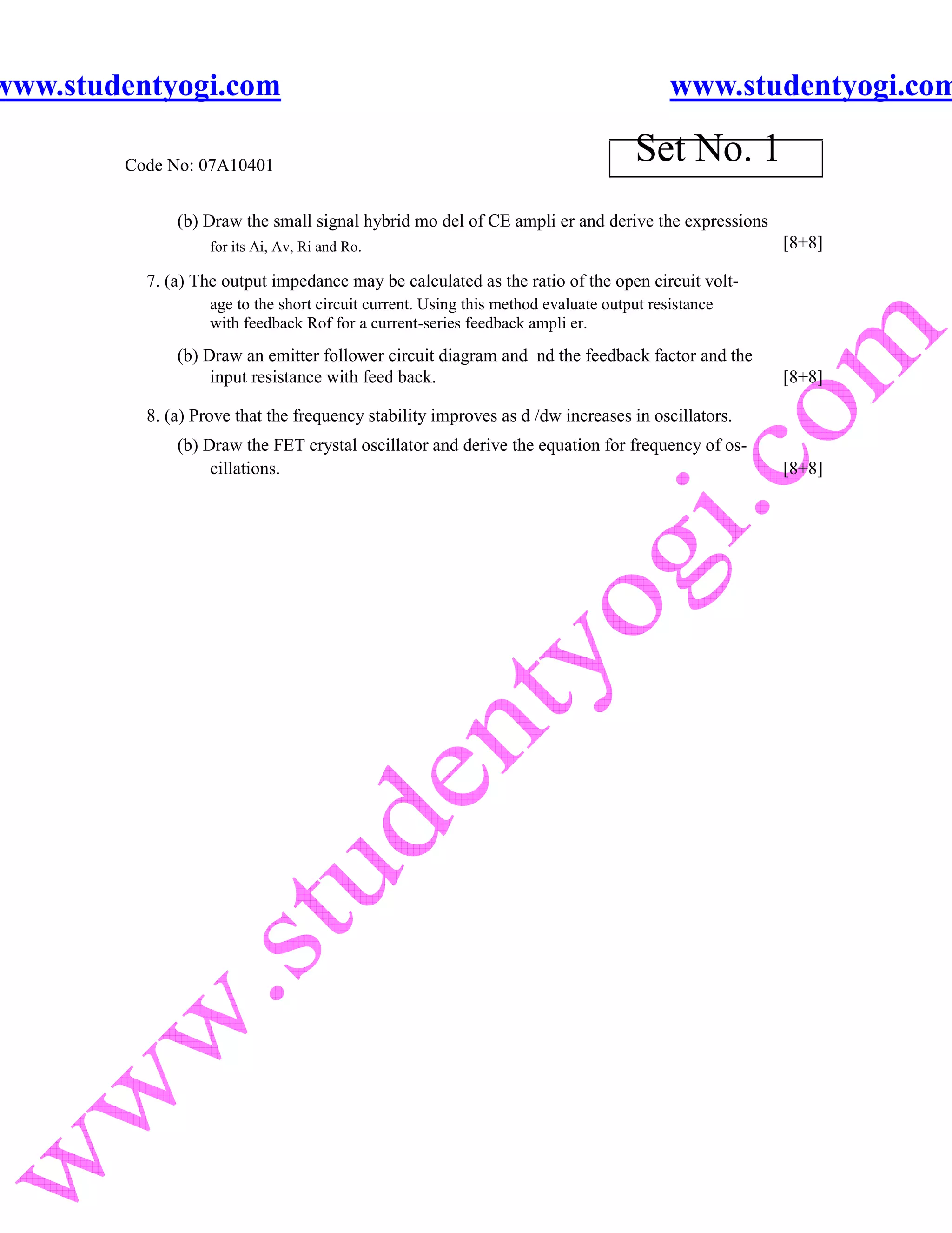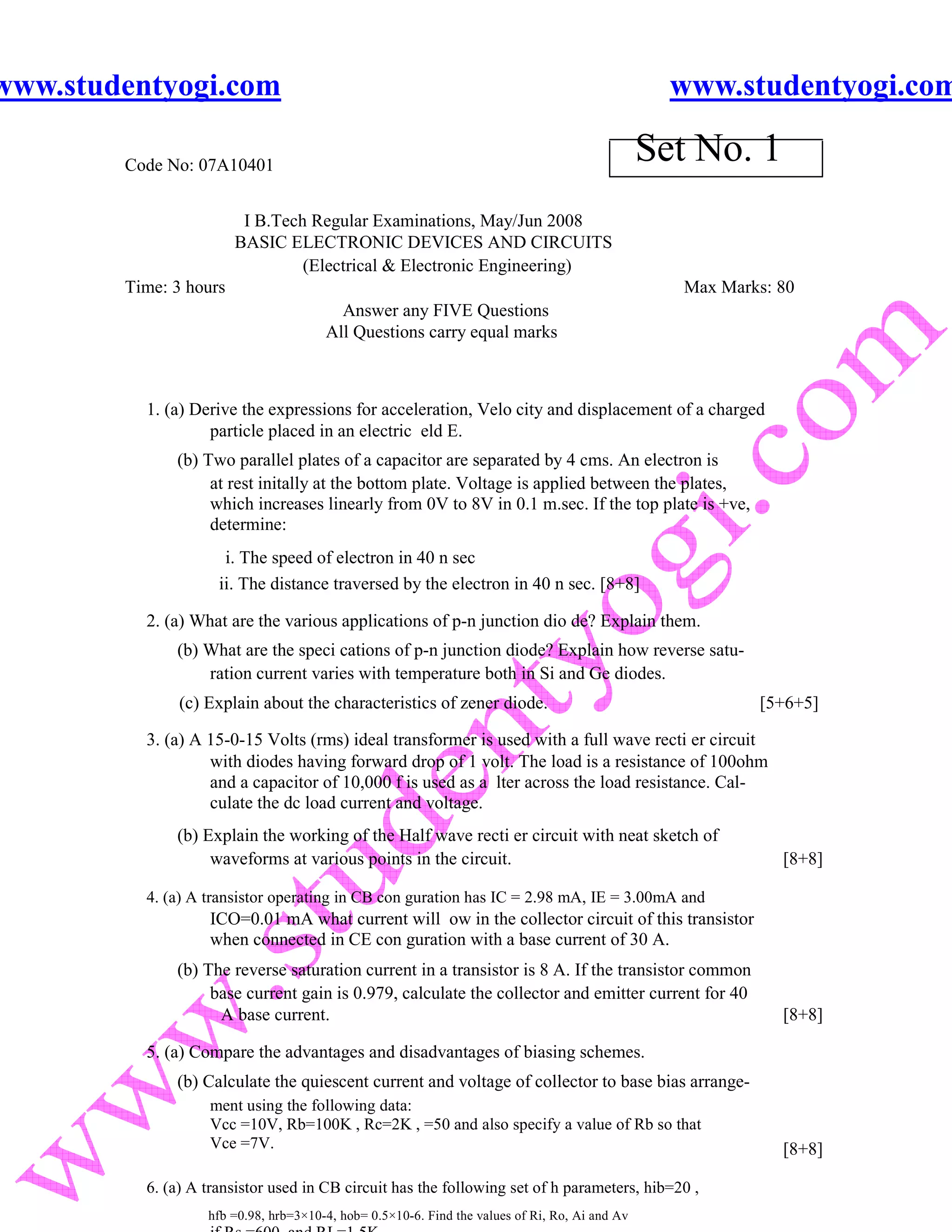 This document contains four sets of questions for an exam on Basic Electronic Devices and Circuits. Each set contains 8 questions related to topics like electric fields, capacitors, diodes, transistors, amplifiers, and oscillators. The questions test understanding of concepts and involve calculations related to electronic devices and circuits.