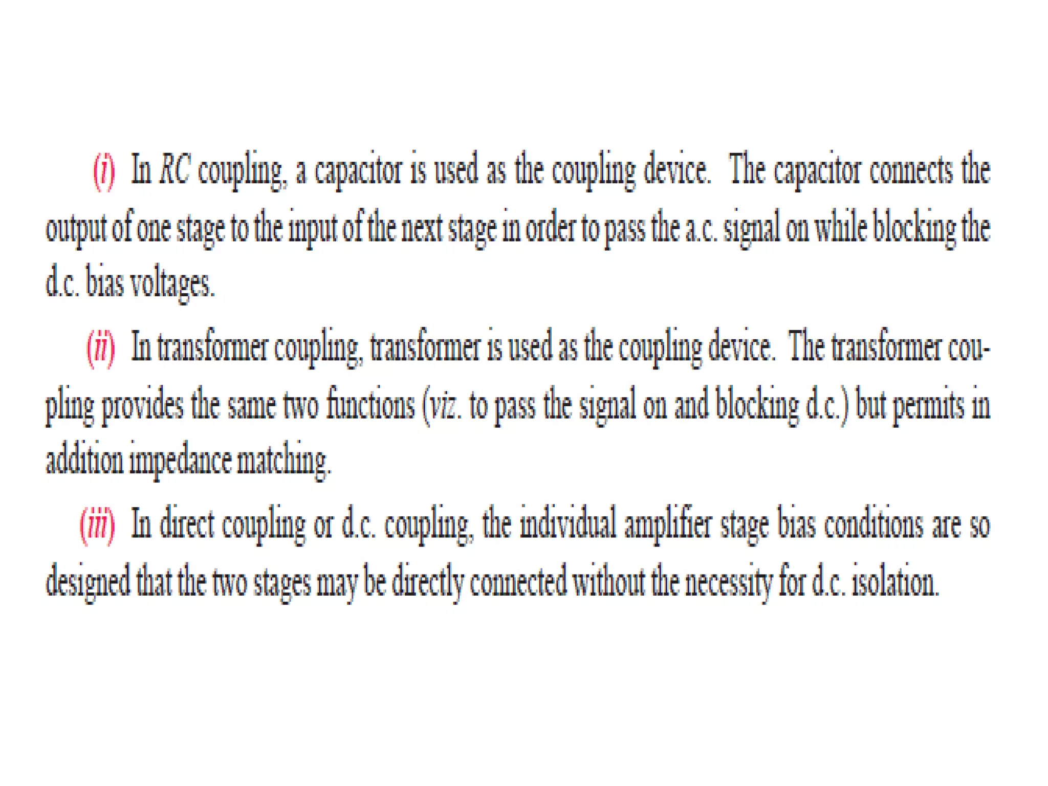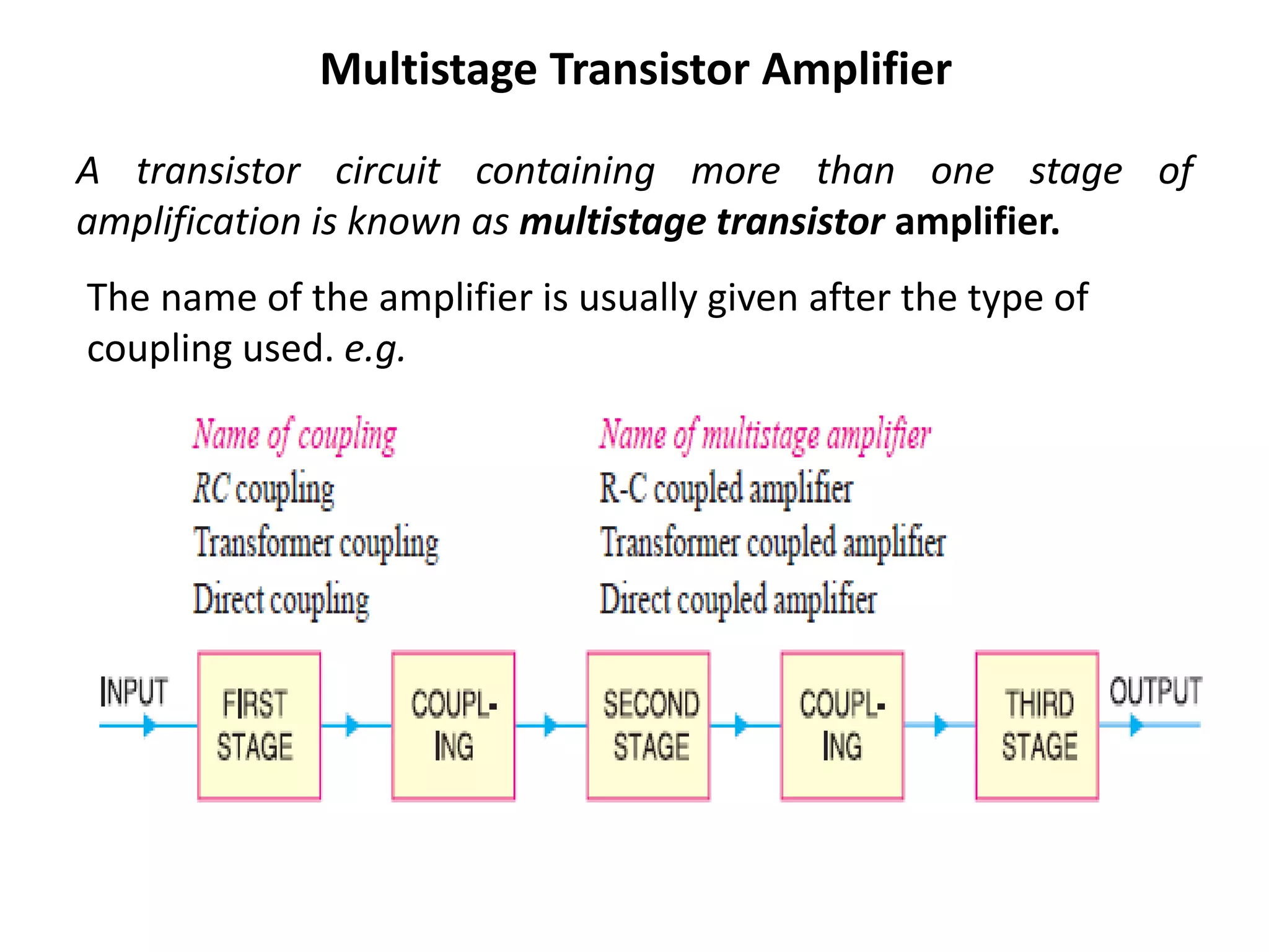 This document discusses different types of multistage transistor amplifiers. It describes RC coupled transistor amplifiers and transformer coupled amplifiers. RC coupled amplifiers use capacitors for coupling between stages and provide good audio fidelity over a wide frequency range, but have reduced gain due to loading effects between stages. Transformer coupled amplifiers can provide higher gain through impedance matching but have poor frequency response and introduce distortion. The document also discusses concepts like gain, frequency response, bandwidth, and feedback in transistor amplifiers.