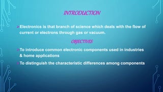 The document provides a detailed overview of basic electronics, covering key components such as resistors, capacitors, diodes, transistors, and rectifiers. It explains the functions, types, and characteristics of these components, along with their applications in circuits. Additionally, the document includes information on measuring techniques and configurations for these components.