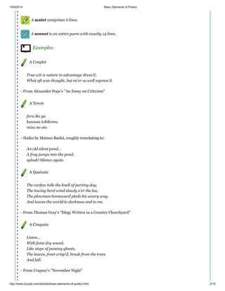 The document discusses the basic elements of poetry, including stanza, rhyme, rhyme scheme, rhythm, and meter. It defines each element and provides examples to illustrate how they are used in poems. Stanza is composed of lines of verse forming a single unit, and can take different forms like a couplet, tercet, quatrain, etc. Rhyme involves similar sounding words at the end of lines. Rhyme scheme describes the pattern of rhymes used across stanzas. Rhythm is based on stressed and unstressed syllables in lines, while meter counts the number and pattern of feet (groups of syllables) in each line.