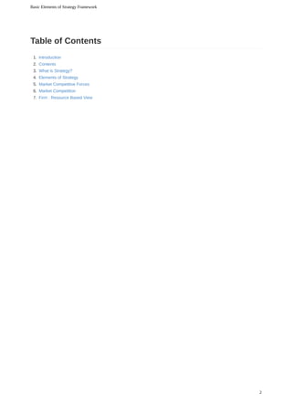The document outlines the fundamental concepts and frameworks essential for understanding business strategy, including definitions of strategy, elements of competitive advantage, and various analytical tools like SWOT and Porter's Five Forces. It emphasizes the importance of strategic analysis for organizations to position themselves effectively in a competitive market. The note serves as a guide for future managers and business leaders to develop strategic thinking and decision-making skills.