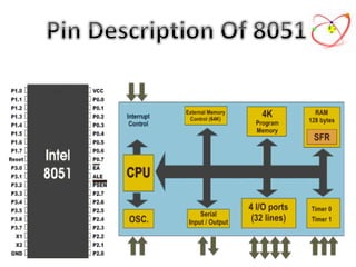 The document presents information about an embedded system project using an 8051 microcontroller. It discusses the 8051 microcontroller architecture, including its memory capabilities and pin description. It then describes different types of sensors like proximity, level, temperature, IR, inductive, capacitive, photoelectric, resistive, and ultrasonic sensors. It also discusses relays and types including electromagnetic and solid state relays. Finally, it lists some basic integrated circuits needed for the project like voltage regulators, comparators, relay drivers, and motor drivers.