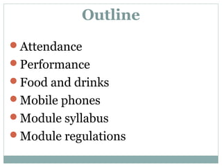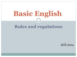 This document outlines the rules and regulations for the Basic English ACE 2014 module. It discusses attendance policies, including requirements to obtain a medical certificate if sick and consequences for poor attendance including not being able to take the final exam. It also addresses expectations for class performance, banning food, drinks, and mobile phone use in class. The module goals are provided relating to language skills, as well as the grading breakdown of assessments. Academic integrity policies are also summarized.