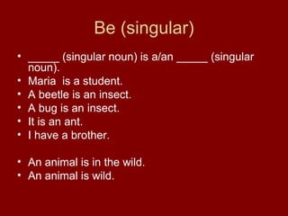 This document provides examples and exercises on using basic English grammar concepts like articles, plural nouns, and verbs like "be" and "have". It includes examples of singular and plural nouns, how to make nouns plural by adding "s" or changing the ending, and examples of sentences using common grammar structures.