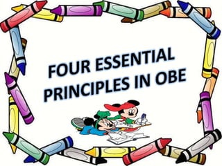 The document outlines the key principles of outcomes-based education including: defining outcomes-based education as focusing on what students should be able to do successfully at the end of learning; identifying the four principles as clarity of focus, designing backwards, high expectations, and expanded opportunities; and describing how teaching, learning, and assessment relate to outcomes-based education and students' responsibilities for their own learning.