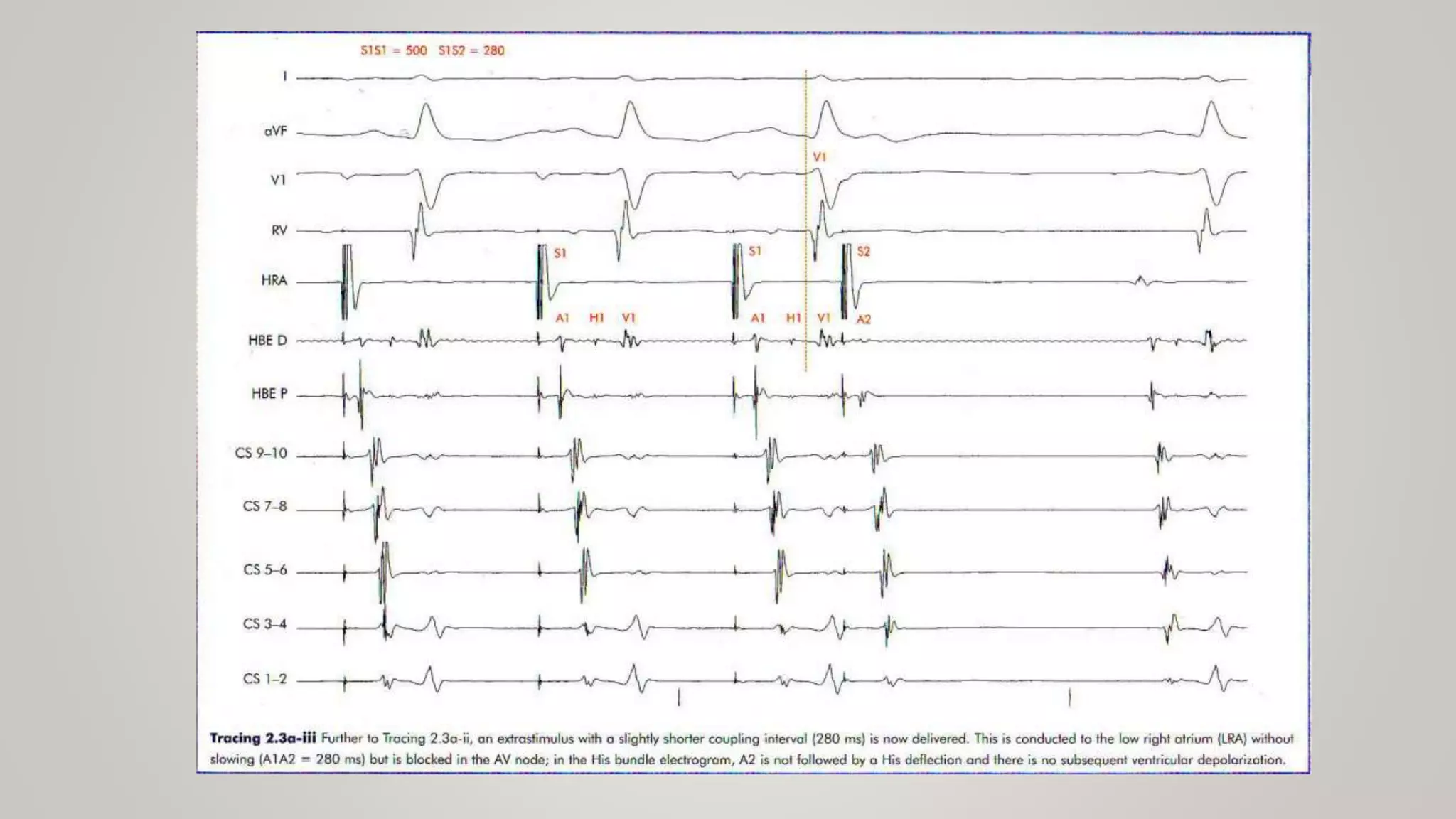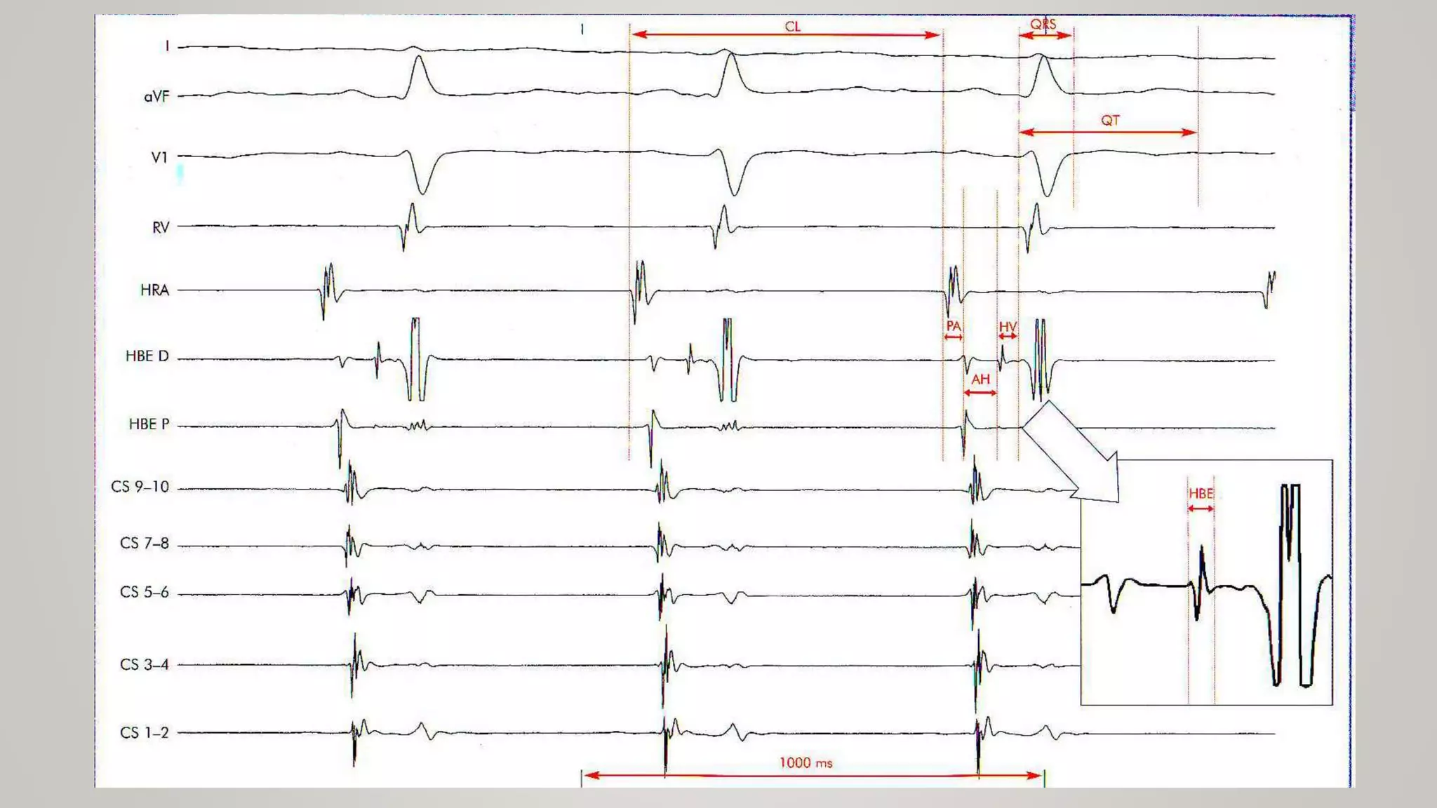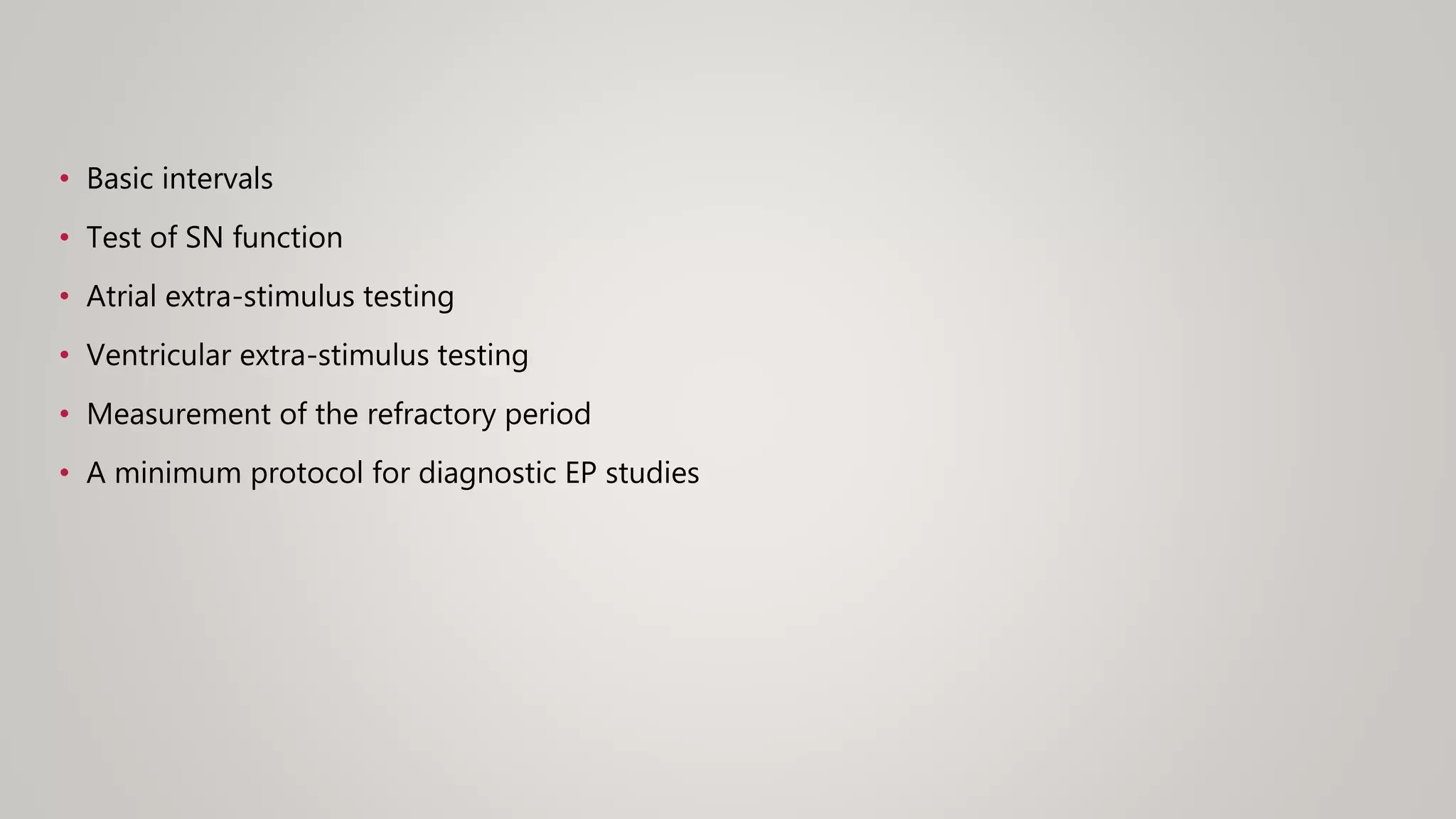 This document outlines the key components of a basic electrophysiology (EP) study, including measuring basic intervals like PA, AH, and HV; testing sinus node function with measurements like sinus node recovery time; performing atrial and ventricular extra-stimulus testing to determine refractory periods; and conducting a minimum protocol involving basic interval measurements, sinus node assessment, ventricular and atrial extra-stimulus testing, and incremental pacing. The purpose is to provide diagnostic information about cardiac conduction and rhythm.