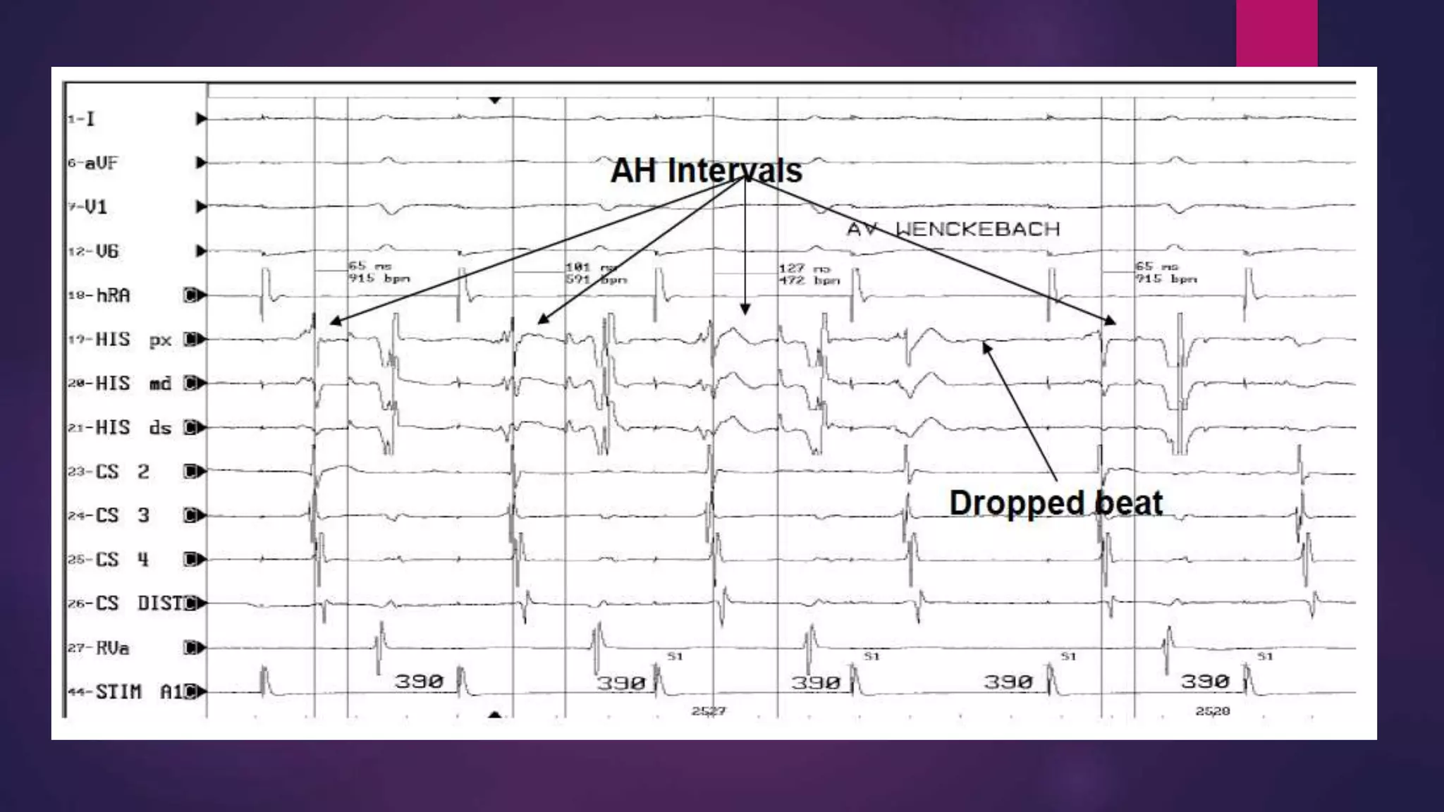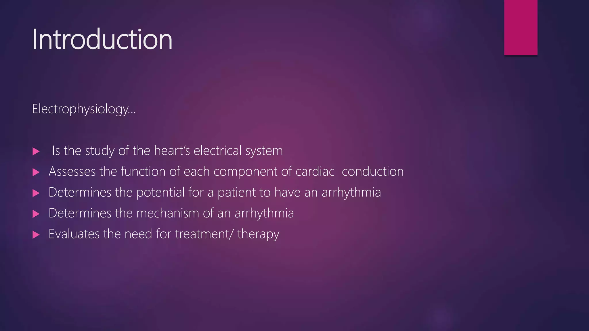 This document provides an overview of basic electrophysiology (EP) studies, which assess the heart's electrical system and conduction pathways. EP studies are used to diagnose and treat cardiac arrhythmias by characterizing atrial and ventricular properties, identifying accessory pathways, and guiding interventions like ablation. Key aspects covered include: indications for EP studies; equipment used; catheter placement; measurement of intervals like AH and HV; pacing protocols to assess refractory periods; and response patterns to extra stimuli.