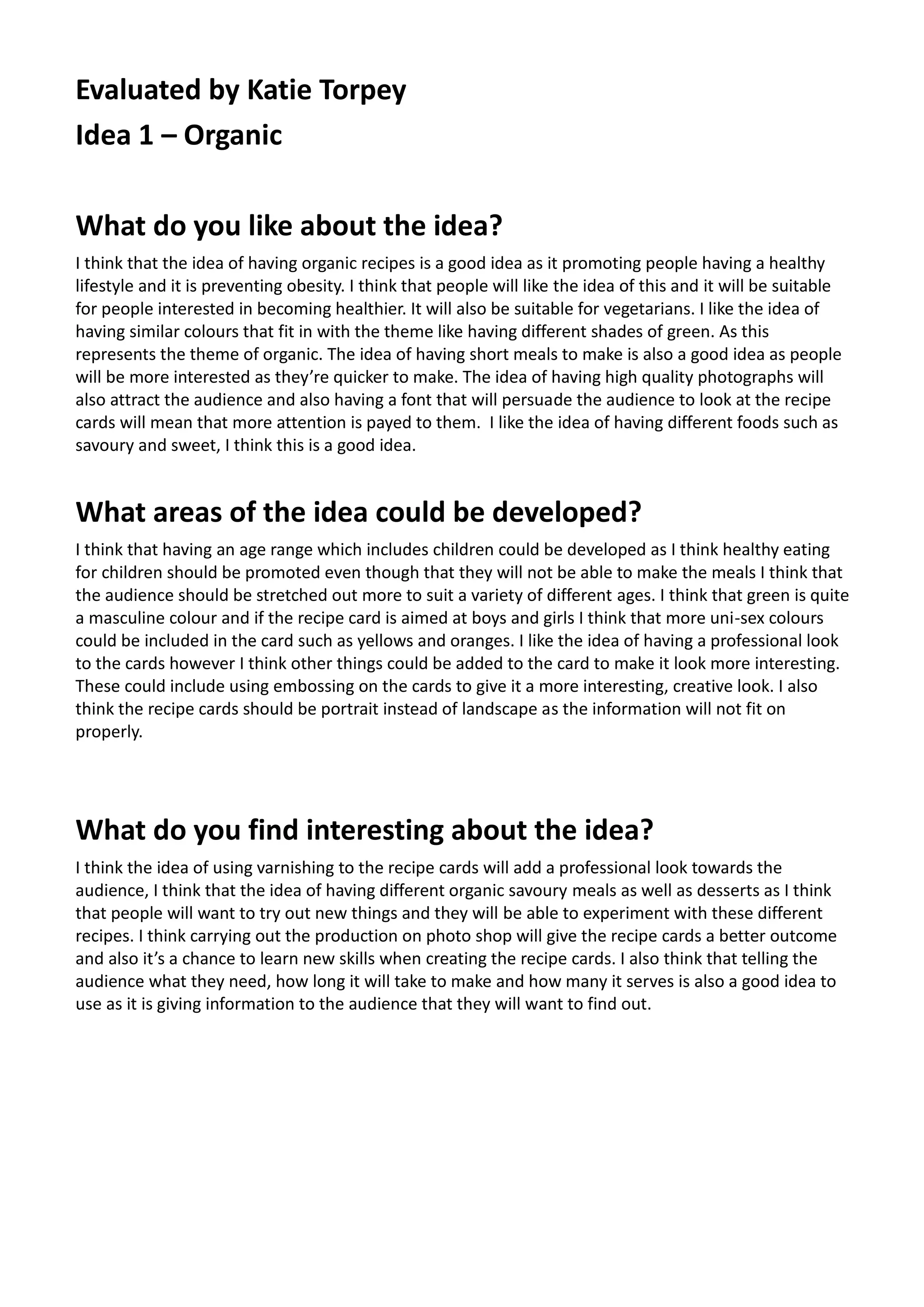 The document evaluates two ideas for recipe cards: