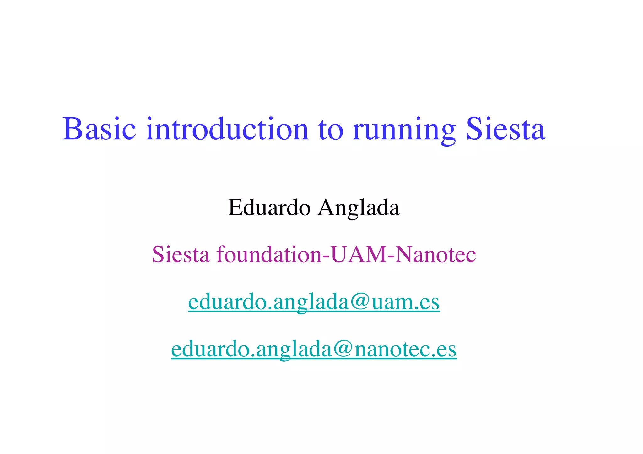 The document provides an introduction to running the Siesta software package for performing density functional theory (DFT) calculations. It describes the basic input variables needed, including system descriptors, structural parameters, functional and basis set specifications. It also outlines how to run Siesta from the command line and analyze outputs such as electronic band structures, densities of states, and charge densities. Post-processing tools are also summarized.