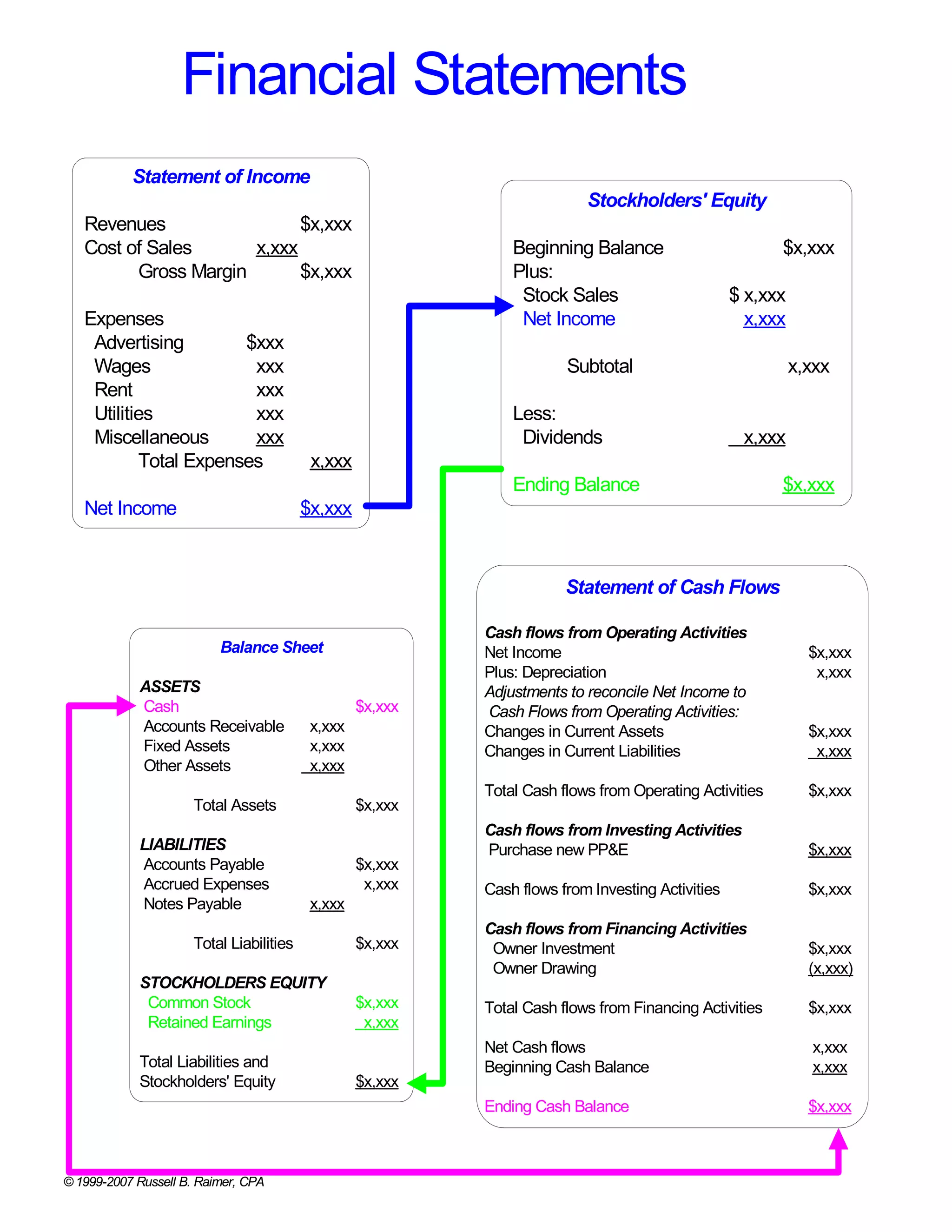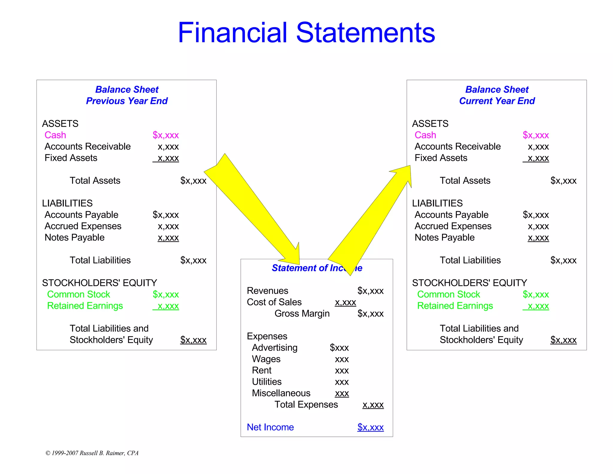 The financial documents show the company's revenues, expenses, assets, liabilities, and cash flows for the year. Revenues exceeded costs and expenses, resulting in net income. Cash increased from operating activities like sales and decreased from investing activities like equipment purchases. The company has assets like cash and equipment to operate, and liabilities like payables and debt.