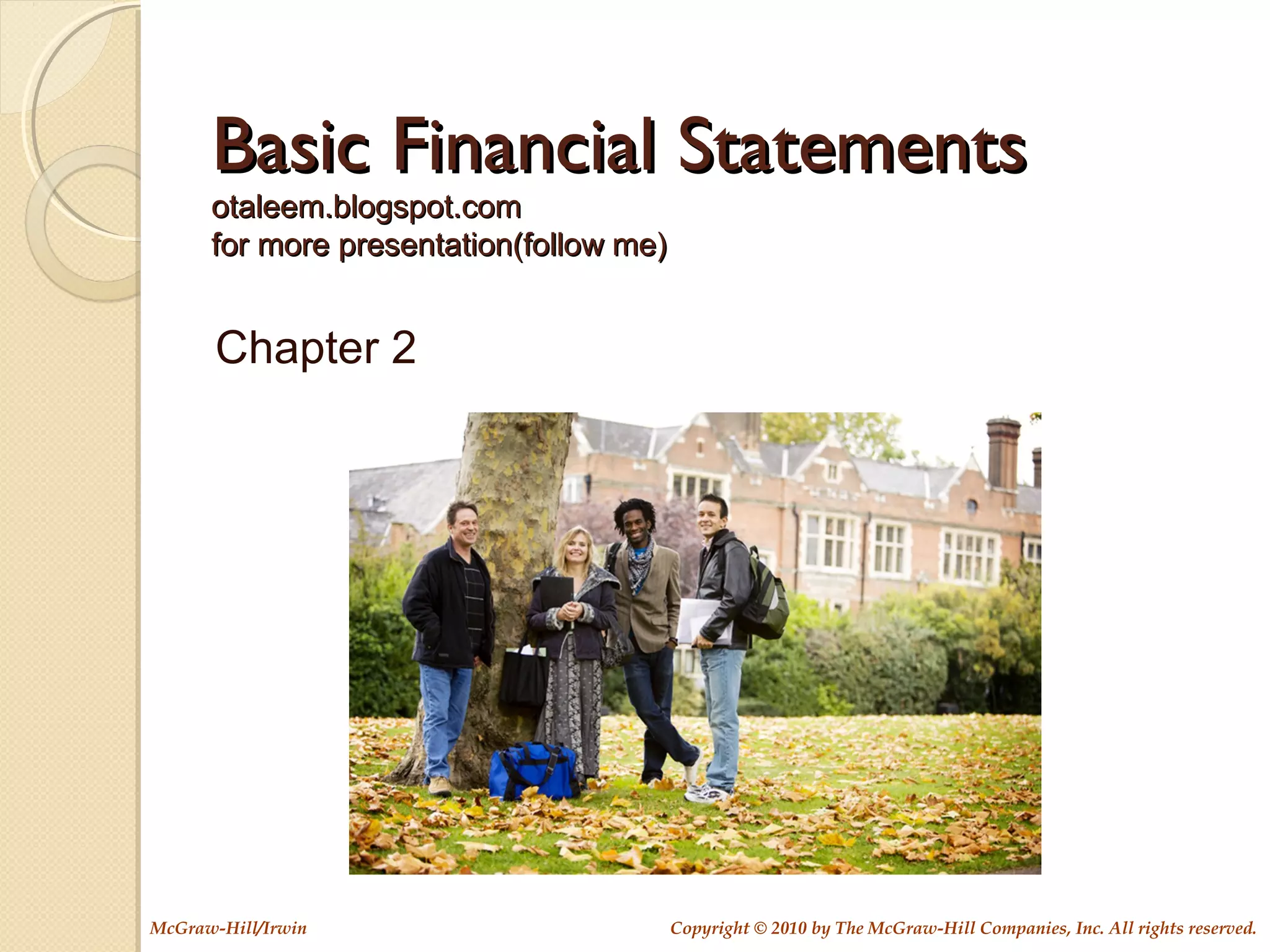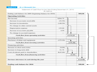 The document outlines the three primary financial statements: the income statement, balance sheet, and cash flow statement, explaining their purpose and how they depict financial data over specific time periods or at specific dates. It uses the example of the Vagabond Travel Agency to illustrate the elements of these statements, discussing assets, liabilities, and owners' equity, as well as the accounting equation. Additionally, it details the cash flow statement's structure, emphasizing the sources and uses of cash within a business.
