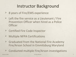 The document outlines a training course for law enforcement regarding fire investigations, focusing on the scientific principles of fire behavior, legal aspects, and the roles of firefighters and police officers in such investigations. It covers objectives such as documenting fire scenes, identifying suspicious patterns, and understanding the motivations behind fire setting. Additionally, it addresses evidence collection and the importance of collaboration between fire agencies and law enforcement.