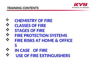 The document covers essential fire safety training topics including the chemistry of fire, fire classes and stages, common fire hazards, and fire protection systems. It emphasizes the importance of prevention, appropriate responses to fire situations, and the proper use of fire extinguishers using the P.A.S.S. method. Additionally, it outlines necessary procedures for evacuation and the significance of maintaining unobstructed exit routes in workplaces.