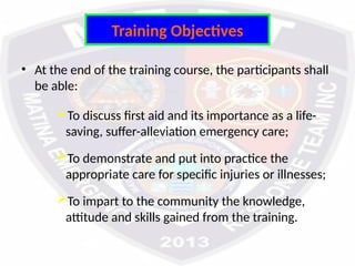 The document outlines the objectives and guidelines of a basic first aid training course designed for emergency response teams. It covers important topics such as the importance of first aid, roles, and permissions, types of injuries, and first aid management techniques for various scenarios. The training emphasizes both theoretical knowledge and practical skills, aiming to equip participants with the ability to provide effective emergency care.