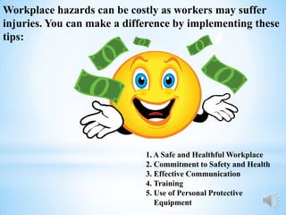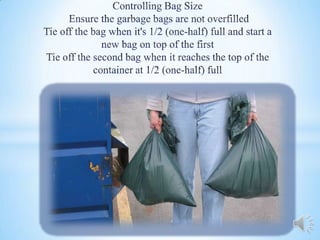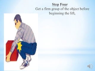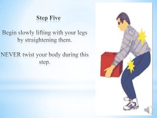 This document provides tips for food service workers to improve safety when performing various tasks. It discusses proper techniques for sweeping, mopping, lifting buckets, pushing carts, emptying trash, and cleaning. Key recommendations include avoiding awkward postures and twisting, lifting with the legs, getting help for heavy loads, and using personal protective equipment. The goal is to reduce injuries by focusing on ergonomics and following safe practices.
