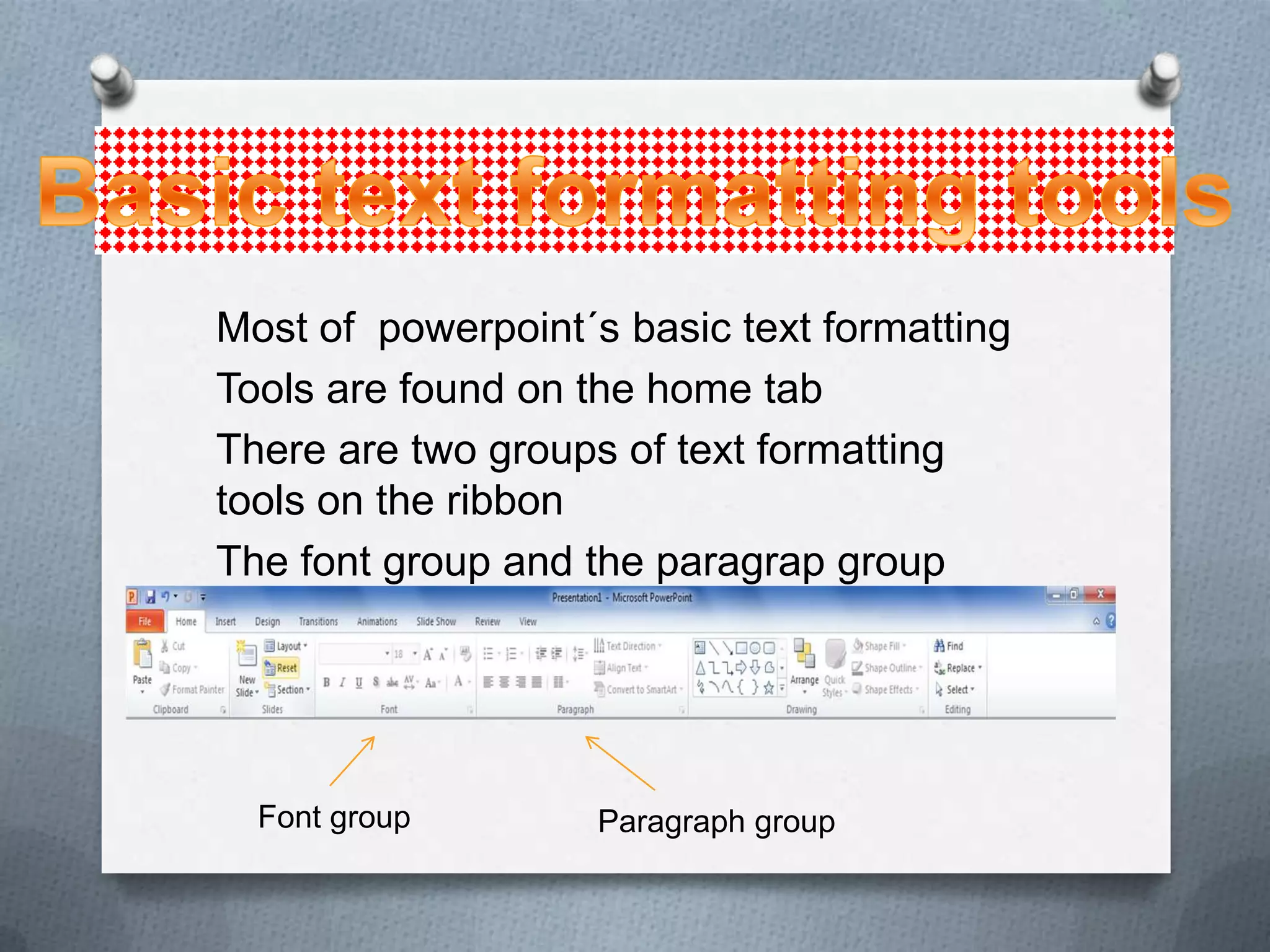 The document discusses various text formatting tools in PowerPoint including fonts, font styles, formatting with the format painter, paragraph formatting options like indentation, numbered lists, text box formatting features like color, effects, and wrapping text. It also covers checking spelling and using the thesaurus.