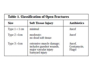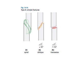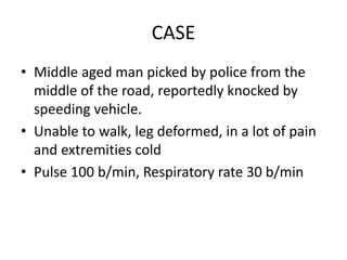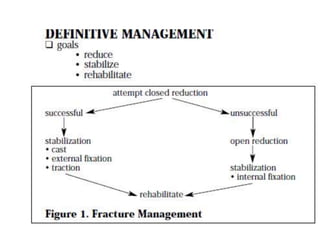 This document discusses the basic principles of fracture management. It begins by describing the case of a man found injured on the road after being hit by a vehicle. It then defines a fracture and outlines the key steps in identifying and initially managing fractures, including assessing life threats, identifying specific injuries, providing emergency treatment, and obtaining a history. It discusses fracture mechanisms and clinical features. The document emphasizes the importance of initial stabilization, splinting, analgesia, and obtaining x-rays before and after reduction. It describes indications for open versus closed reduction and different stabilization methods. Finally, it covers rehabilitation, the emergency treatment of open fractures, and potential complications.