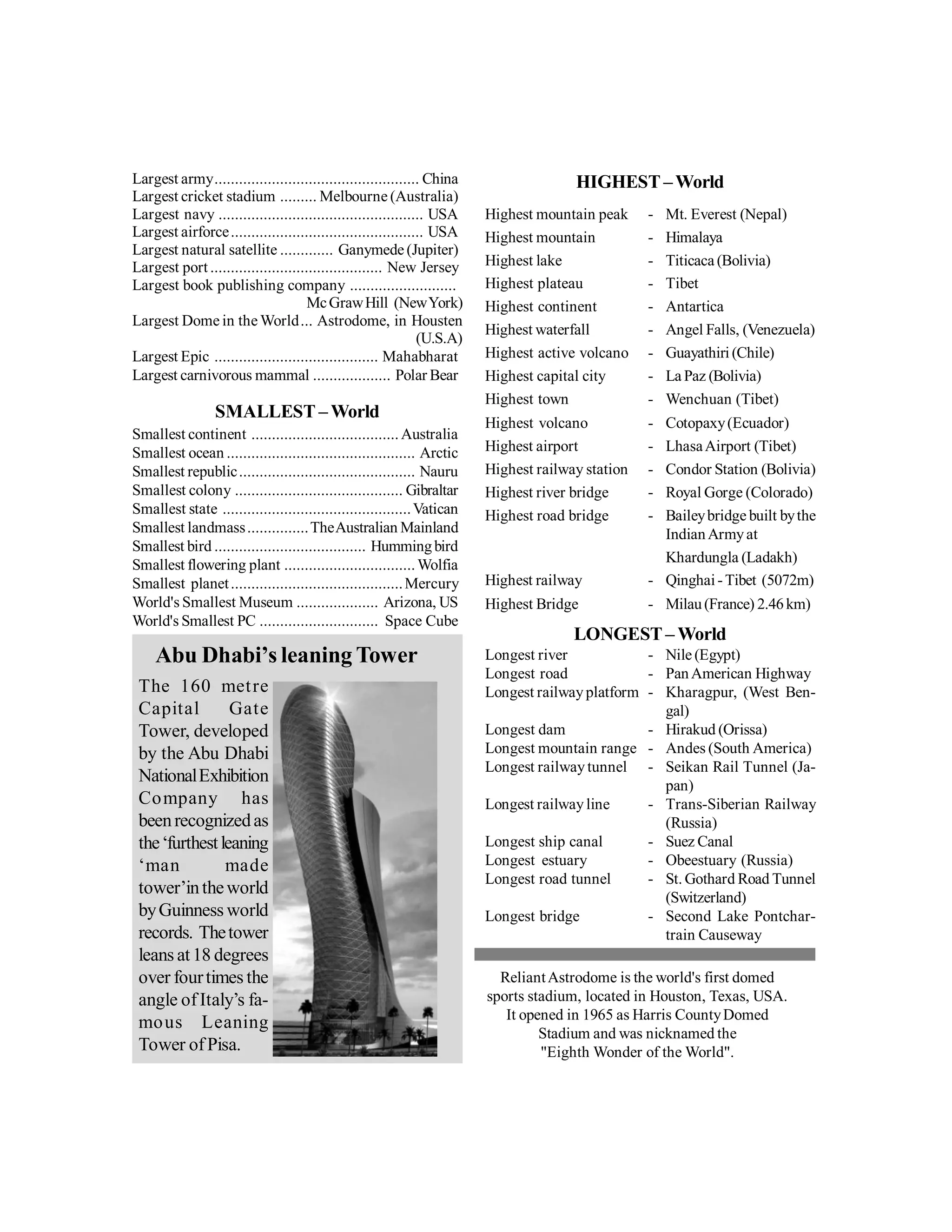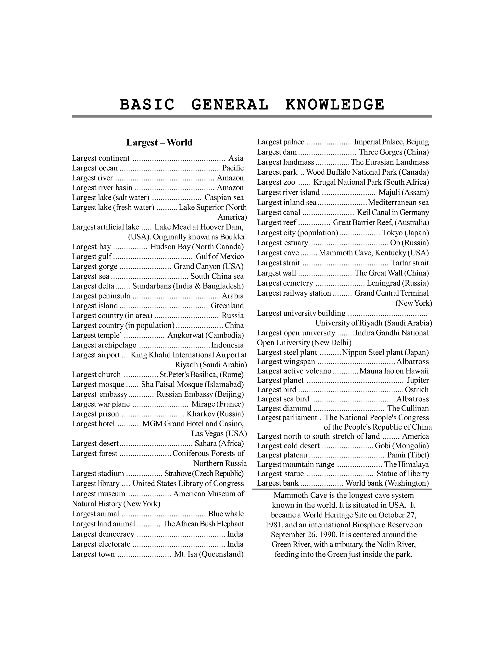 The document lists various natural and man-made geographic superlatives around the world, including the largest continent (Asia), largest ocean (Pacific), and longest river (Nile). It also provides details on the tallest structures like Burj Khalifa, largest lakes like Lake Superior, and deepest locations such as the Pacific Ocean. Mammoth Cave is highlighted as the longest cave system in the world, located in Kentucky, USA.