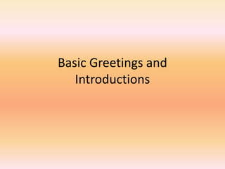 This document provides basic greetings and phrases for introductions in English, including "Hi!", "Hello!", and questions like "What's your name?" and "How are you?". It also gives an example introduction dialogue between a student and teacher where they exchange names and ask about each other's well-being.
