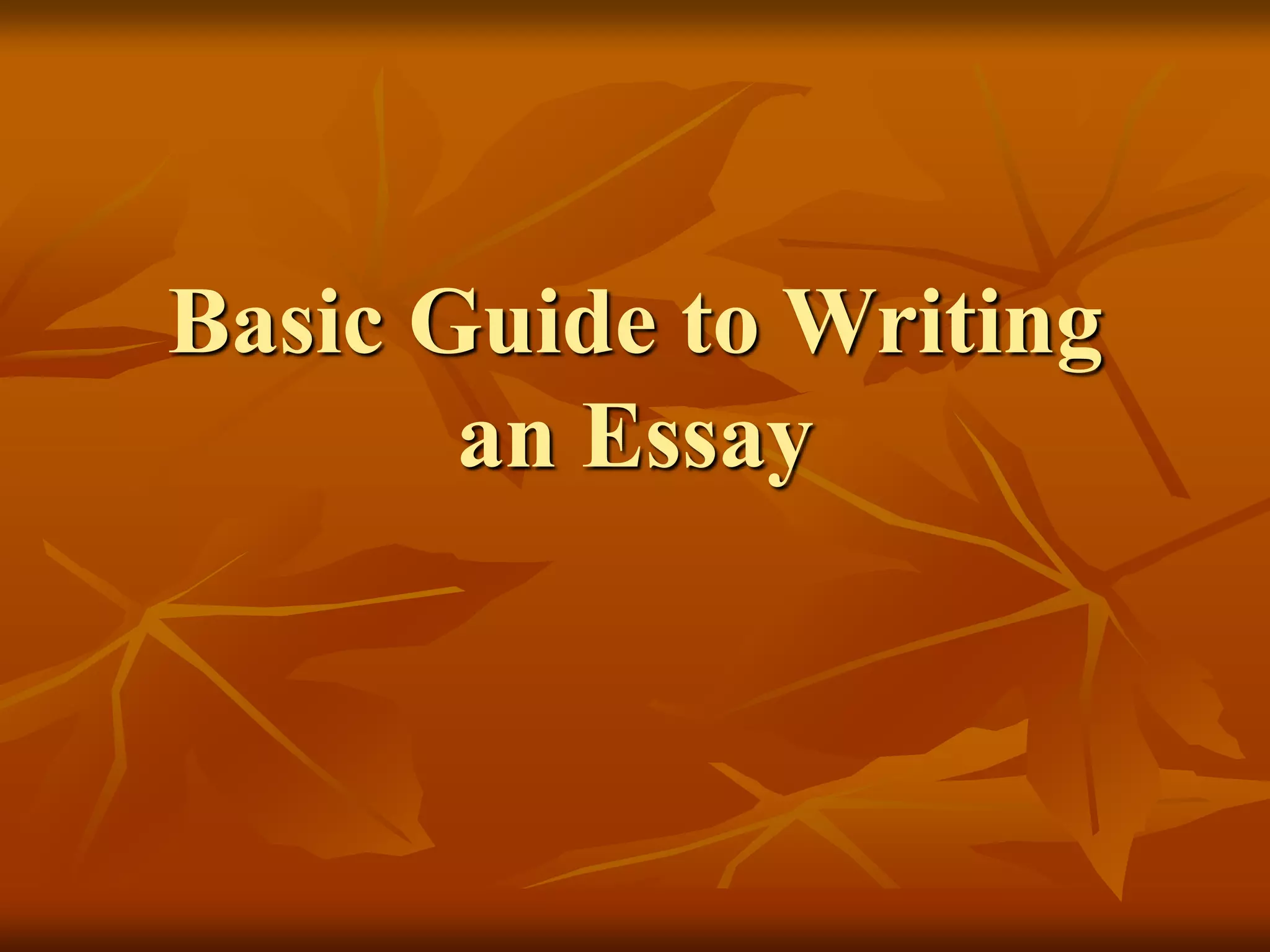 This document provides a basic guide to writing an essay. It explains that all essays have the same basic format and structure regardless of their purpose. The guide then outlines the typical essay writing process, which includes choosing a topic, creating an outline, writing a thesis statement, composing body paragraphs, and drafting an introduction and conclusion. Each step is described in one to three sentences. Key elements like outlining main ideas and supporting points, elaborating on ideas in body paragraphs, and using attention-grabbing techniques in introductions are highlighted at a high level.