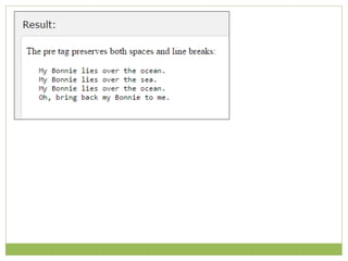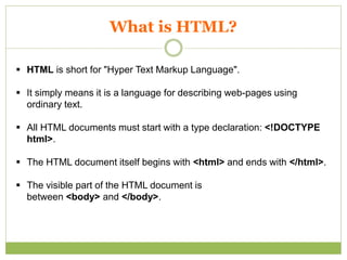 HTML, or Hypertext Markup Language, is used to create and describe web pages while key components include elements, tags, and attributes that define the structure and formatting of content. Each HTML document begins with a declaration and contains nested elements, which may or may not have closing tags. CSS (Cascading Style Sheets) can be utilized for styling HTML elements, applied using inline, internal, or external methods.
