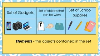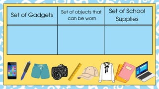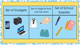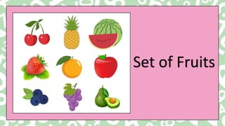 The document lists various sets, including fruits, instruments, shapes, and celestial bodies, along with number sets that represent different mathematical concepts such as infinity, integers, even and odd numbers, prime numbers, and perfect squares. These sets illustrate basic mathematical groupings and properties. The content suggests a focus on categorization within mathematics.