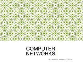 A computer network allows multiple computers to connect and share resources. It usually uses physical wires or cables to connect computers. There are different types of networks including local area networks (LANs), personal area networks (PANs), metropolitan area networks (MANs), wide area networks (WANs), wireless local area networks (WLANs), and campus area networks. LANs connect computers within a building while WANs connect LANs over longer distances.