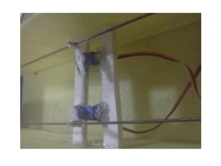 The document provides information on the control surfaces and aerodynamic components of an aircraft. It discusses that elevators control pitch, ailerons control roll, and the rudder controls yaw. It also mentions vertical and horizontal stabilizers provide stability and prevent pitching and yawing motions. The document further provides details on requirements, wing design and construction, airfoils, servos, engines, batteries, and tips for stability.