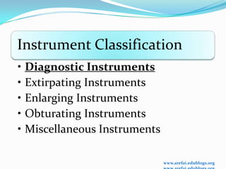 The document discusses endodontic instruments and their classification. It covers diagnostic instruments like mirrors, probes and tweezers used for examination. Extirpating instruments like barbed broaches are discussed. Enlarging instruments include both hand-driven ones like K-files and engine-driven rotary files and ultrasonic/sonic instruments. Obturating instruments are categorized into those using non-softened gutta percha like spreaders and softened gutta percha ones like thermal applicators and injection systems. Miscellaneous instruments like apex locators are also mentioned. The document provides details on various types under each classification with diagrams.