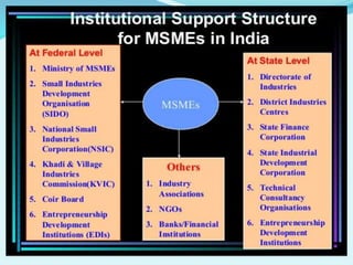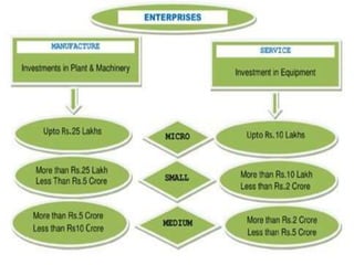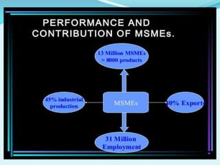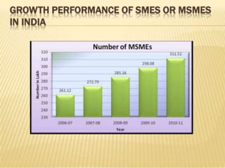 The document discusses Micro, Small, and Medium Enterprises (MSMEs) in India and their role in economic growth. Some key points: