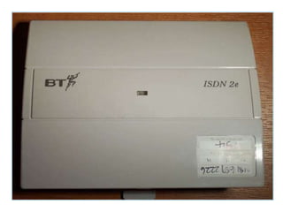 The document discusses digital telephony and ISDN (Integrated Services Digital Network). It explains how analog signals are converted to digital using pulse code modulation and sampling. It describes the basic rate interface of ISDN which provides 2 B-channels and 1 D-channel. It also discusses primary rate interface which provides 30 B-channels and 1 D-channel over an E1 line. It provides details on ISDN protocols and equipment such as NTEs, reference points, and numbering options for basic and primary rate ISDN.