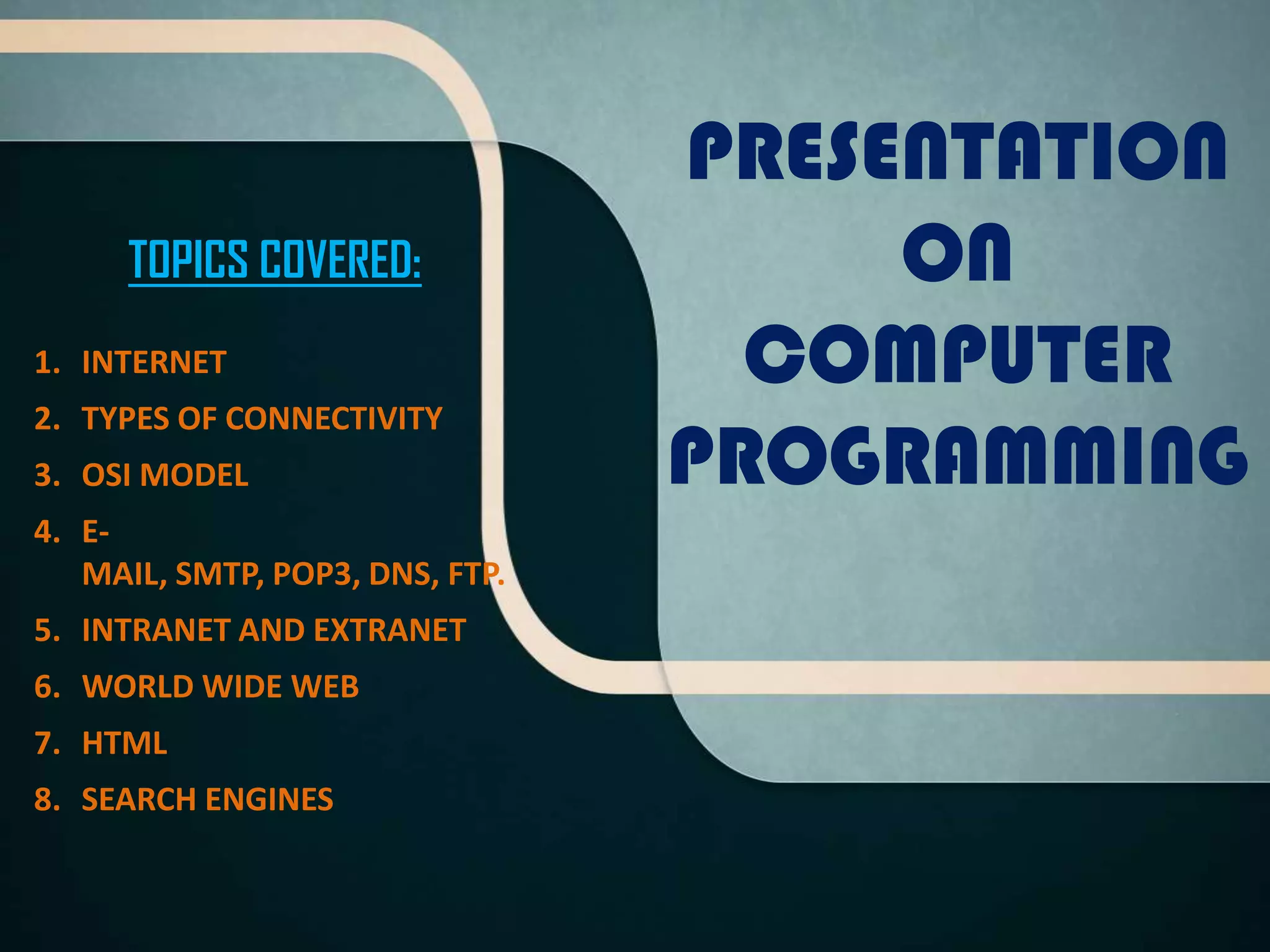 This document provides an overview of topics related to the internet and computer programming. It discusses the internet and types of connectivity like analog modems, DSL, and wireless. It describes the OSI model and protocols like email, SMTP, POP3, DNS, and FTP. It also covers intranets and extranets. Other topics include the world wide web, HTML, and search engines. Presentation slides are included on each of these topics with details on definitions, components, benefits, and limitations.