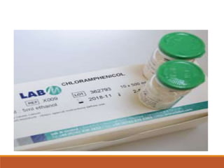 The document discusses protein synthesis and its inhibitors, detailing various antibiotics such as tetracyclines, chloramphenicol, and macrolides, along with their pharmacology, mechanisms of action, and resistance patterns. Tetracyclines are broad-spectrum antibiotics effective against various bacteria, while chloramphenicol is noted for its use in treating typhoid fever and macrolides like erythromycin are used for patients allergic to penicillin. The document emphasizes the selective antimicrobial action based on the structural differences between bacterial and mammalian ribosomes.
